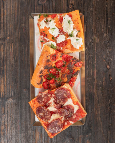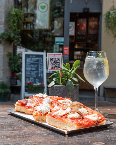La pizza al Taglio: una lunga lievitazione e solo ingredienti di alta qualità. Birre artigianali, vini naturali, spritz e cocktails.